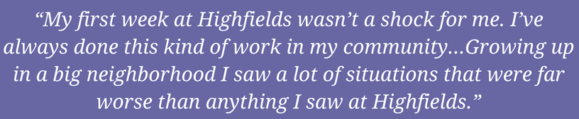 “My first week at Highfields wasn’t a shock for me,” he said. “I’ve always done this kind of work in my community, and in the schools I went to. I was always one of the go-to people for advice. Growing up in a big neighborhood I saw a lot of situations that were far worse than anything I saw at Highfields.”