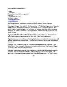 MDE to Visit Highfields’ Reaching Higher Classroom