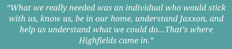 “What we really needed was an individual who would stick with us, know us, be in our home, understand Jaxxon, and help us understand what we could do,” said Rozanne. “That’s where Highfields came in.”